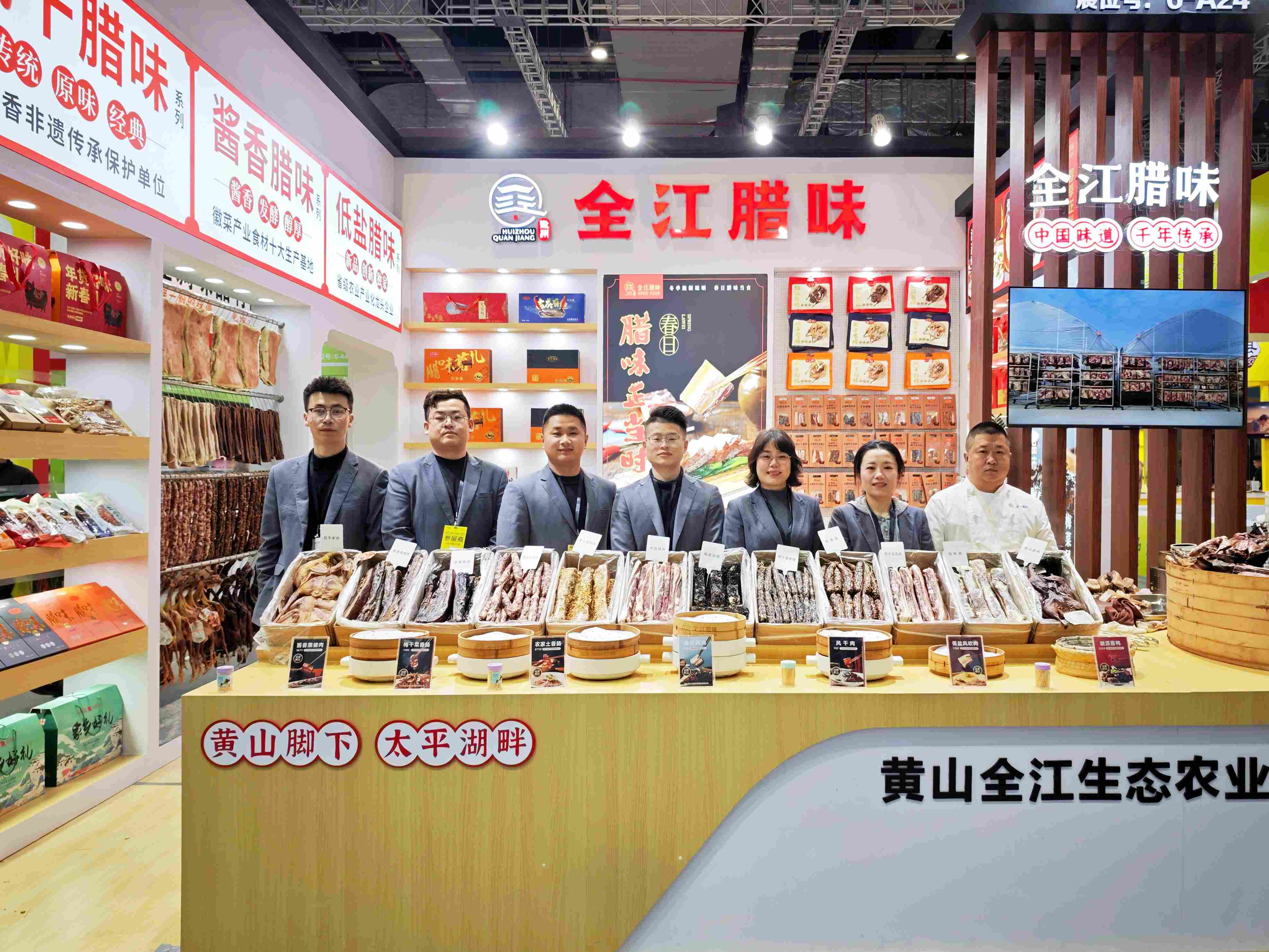 走进全江的展位,仿佛踏入了一个腊味的世界。刀板香、新品风干肉、酱香腊肉、特色香肠……一款款经典腊味产品琳琅满目,散发着诱人的香气。