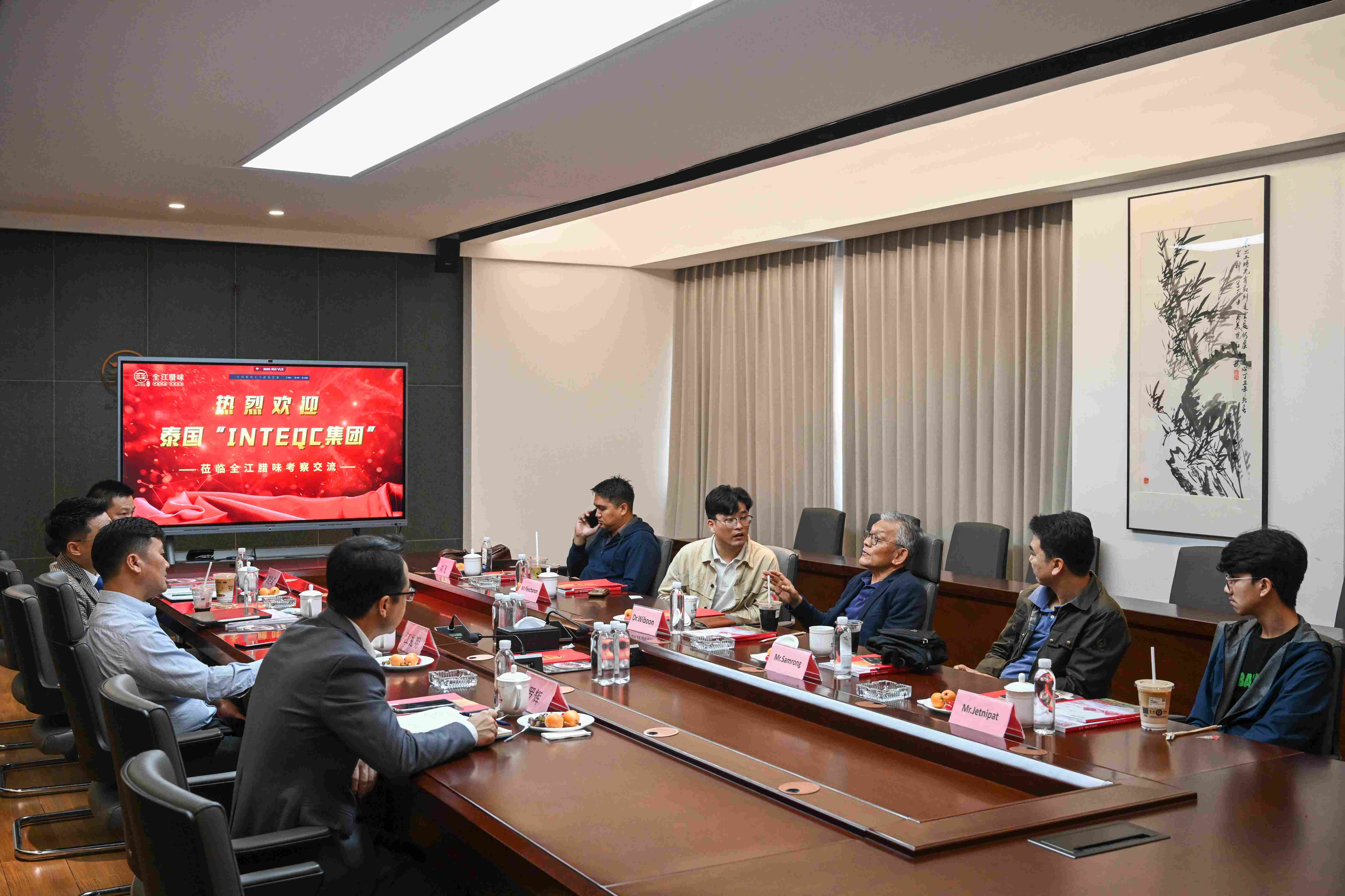 我司董事长江礼明先生,热忱地向贵宾详细阐述公司的发展历程及未来宏图。双方就下一步在腊味产品的合作进行了深入的沟通和交流,共同勾绘出合作蓝图,并顺利达成初步共识。展望未来,我们将携手共进,加强合作,推动徽州腊味进入泰国市场,让更多海外华侨和国人同胞吃上家乡味道!也让这份来自东方的腊味佳肴,绽放出更加绚烂的光彩。