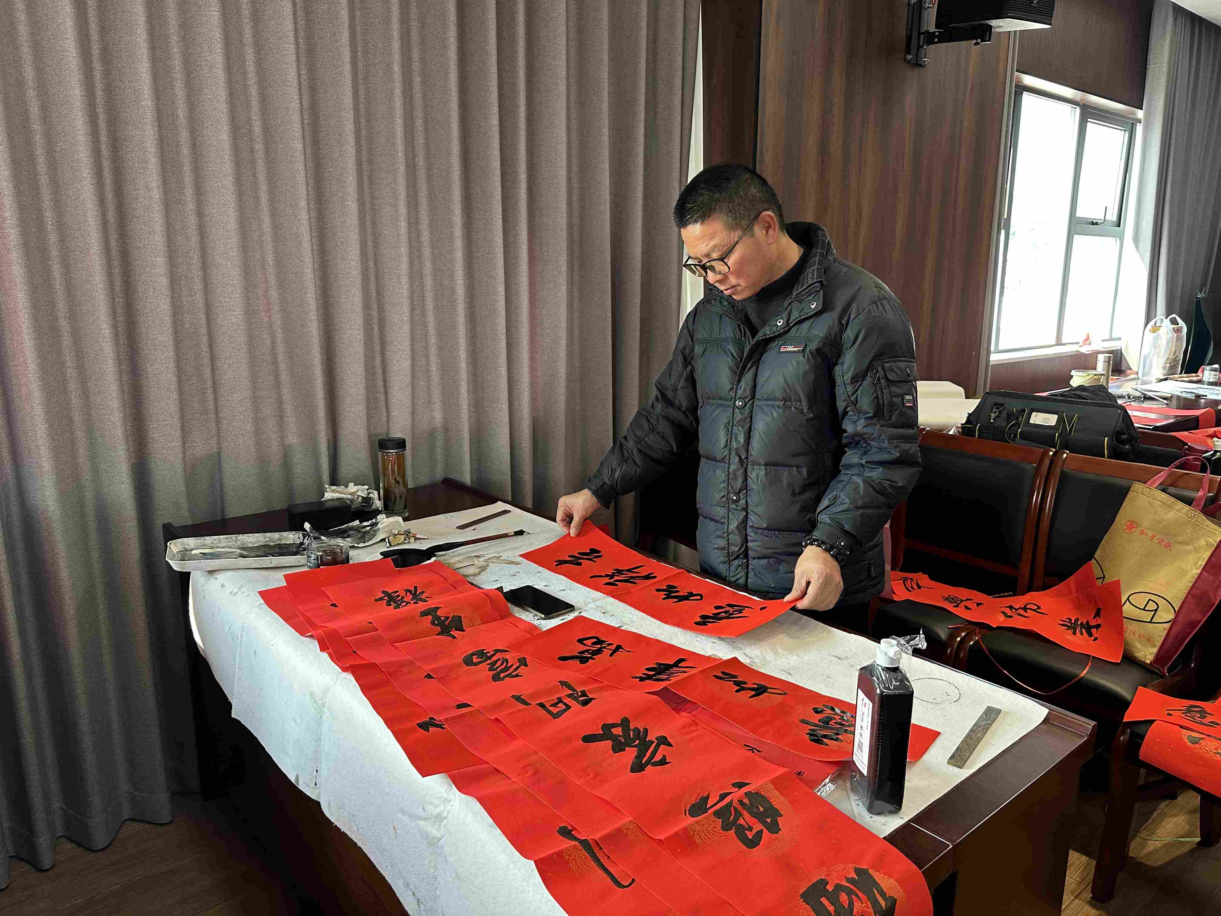 为进一步营造吉祥如意的春节氛围,将祝福传递至千家万户,1月16日,黄山山水国画研究院的工作人员亲切探访全江腊味一线职工,送上新春的美好祝愿。活动现场,众多书法家与书法爱好者挥毫泼墨,笔走龙蛇,用一幅幅寓意吉祥的春联、一张张寄托希望的“福”字,把浓浓的年味儿和新春的祝福送到职工手中,为全江腊味全体职工带来温馨的新年祝福与节日问候,共同憧憬美好新年的到来~