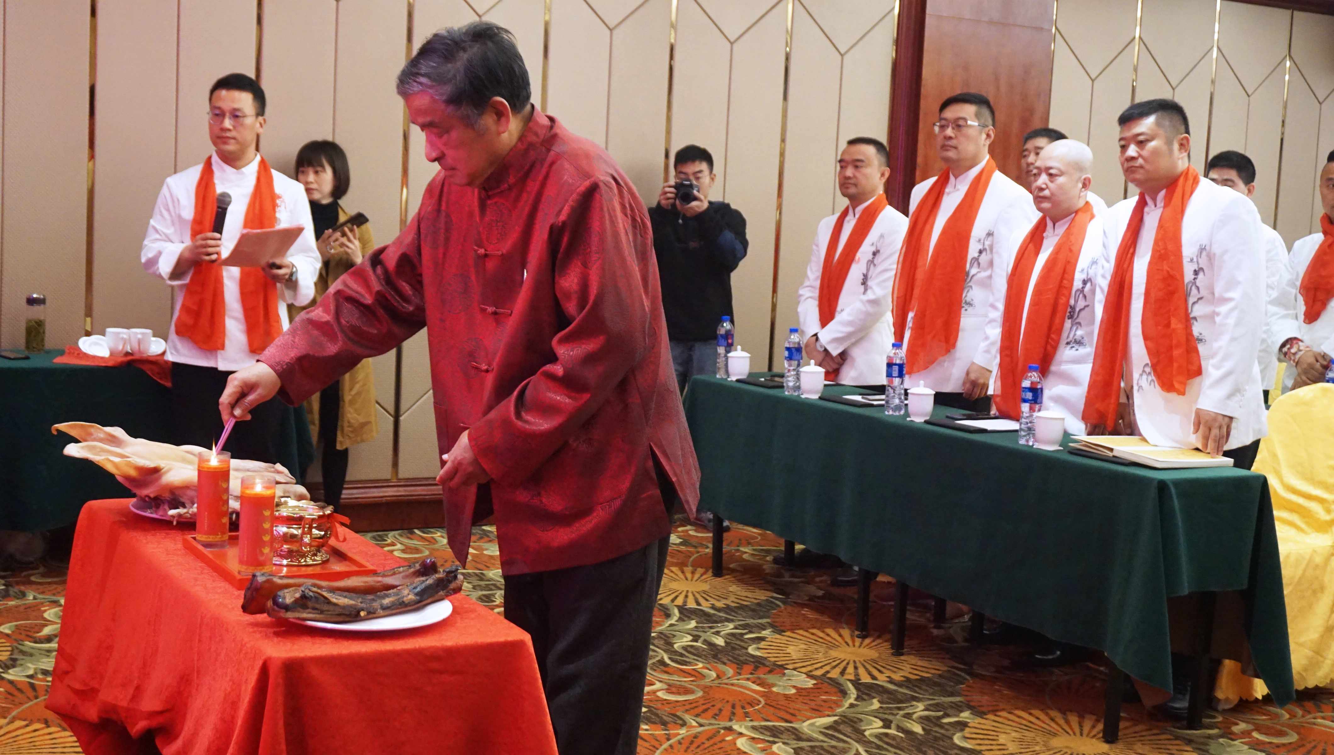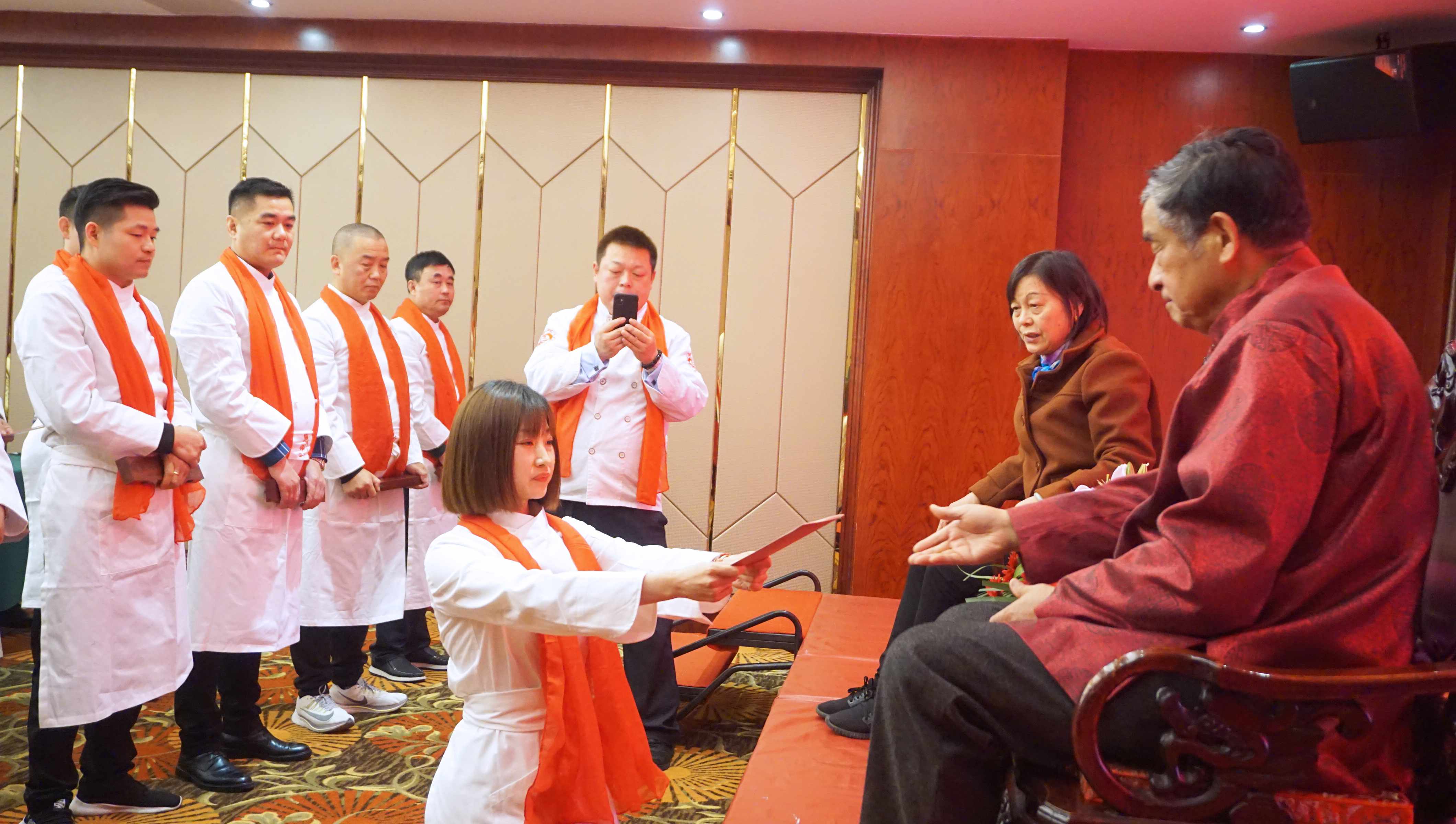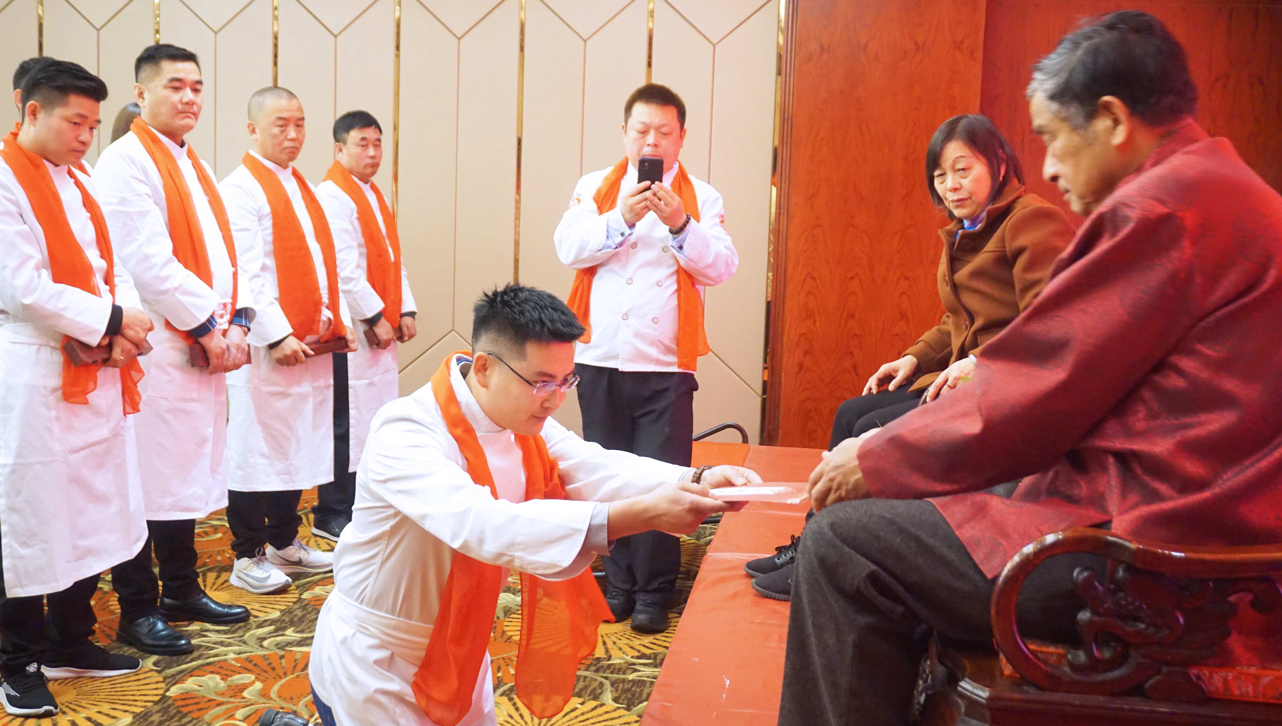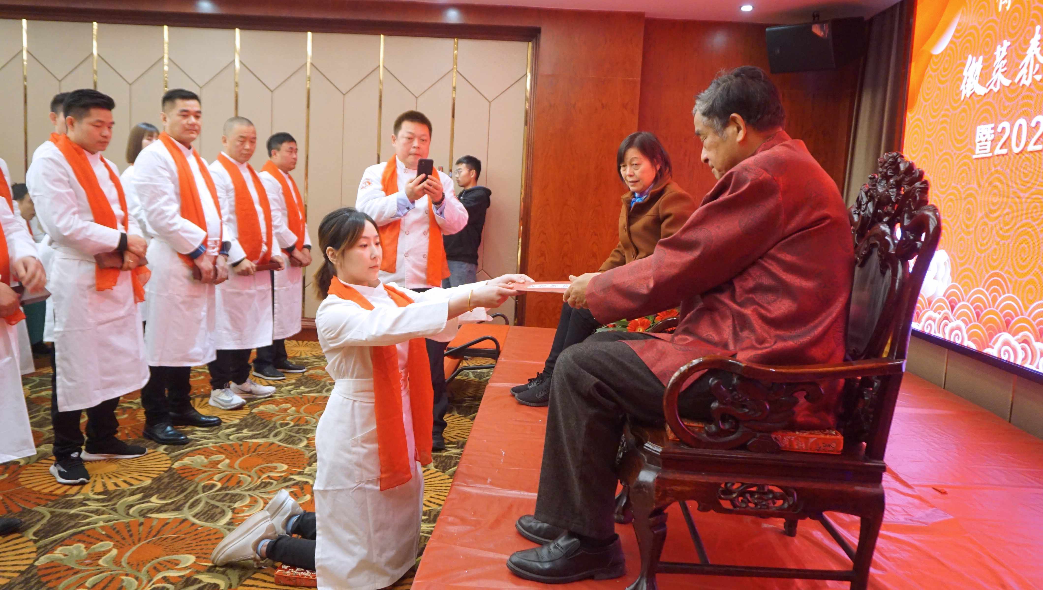 在拜师现场,一系列仪式传统而隆重。在同门师兄的见证下,首先由三代徒弟全江公司董事长江礼明领头,带领三代四代徒弟,诵读拜师帖,表达入门意愿。随后所有弟子依次向师傅提交拜师帖、跪拜仪式、敬茶,师傅回礼,随后合影才算礼成。